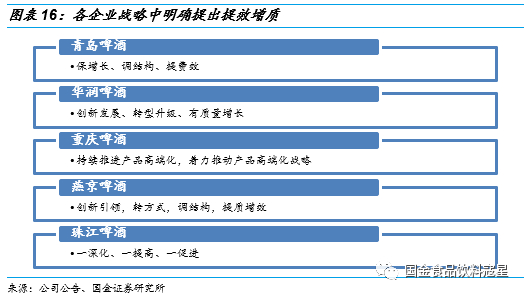 提高管理效率,内部改革要利润:行业增量有限的背景下,各企业纷纷调整战略要求,从战略层面自上而下重新审视公司成长。青岛啤酒提出“保增长、调结构、提费效”的战略目标,在确保增长和市占率的前提下尽可能的促进结构升级和费用使用效率提升。华润扎实推进“创新发展、转型升级、有质量增长”的管理主题,有效抓紧市场机遇。燕京啤酒在发展战略中也明确提出要调结构,提质增效,同样也是为了追求更有质量的成长。各大企业在这一轮行业变革中逐步意识到结构升级和提质增效将是主要目标,通过内部改革追求利润增长,行业回暖趋势明显。