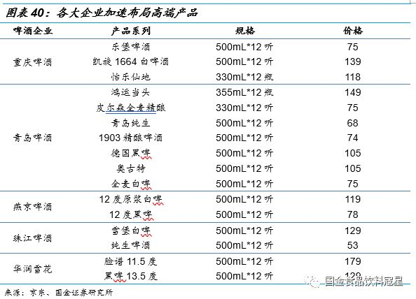 各家加快高端产品线布局,青岛产品最为全面:在中端和低端啤酒已经完全竞争、啤酒消费结构不断上移的背景下,各大啤酒企业纷纷大力丰富高端产品线。啤酒新品中黑啤、白啤、精酿等是主要的研发方向,酿造工艺创新,鲜味提升。青岛啤酒近几年高端产品线中的德国黑啤、全麦白啤、1903精酿啤酒、IPA等市场接受度高,销售规模快速提升。对比行业来看,青岛啤酒是国产啤酒品牌中高端品类最多,最为全面的企业,既体现了公司领先的产品研发能力,又展现了公司新品推广的能力。