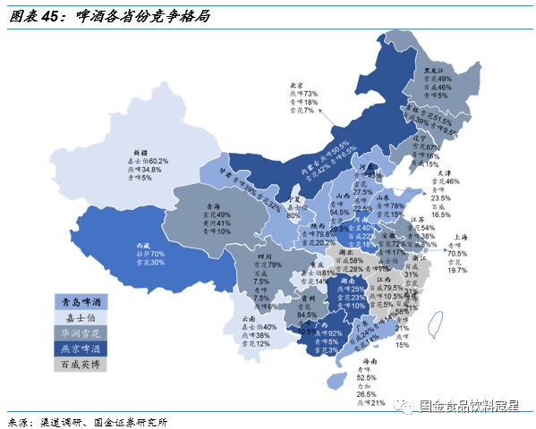 总体来看,华润作为行业龙头,优势市场最多,且从东到西均有覆盖,青岛在黄河沿线省份优势明显,嘉士伯以西南为核心外扩,百威在华中地区市占率较高,燕京核心占据北京市场。