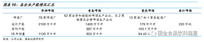 华润和青岛产能行业领先,与其他公司拉开差距:经过近十年的产能建设和优化,华润啤酒设计产能达到2100万千升,成为行业第一;青岛啤酒紧跟其后,拥有62家啤酒企业和1408万千升的设计产能。两大龙头企业产能拥有绝对的领先优势,远高于重庆啤酒的179万千升的设计产能和珠江啤酒220万吨的设计产能,与行业内其他公司拉开较大差距。