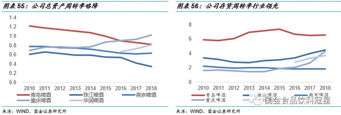 ROE止跌回升,对标重庆啤酒提升空间较大:2017年之前公司ROE持续下跌,股东投资收益效率承压。公司经历了新一轮调整后,近两年ROE止跌回升,主要系净利率提升拉动。行业对比来看,重庆啤酒自引入嘉士伯后经营管理效率明显提升,嘉士伯将国际领先的啤酒企业管理经验引入重庆啤酒,公司2018年ROE水平超过30%。除重庆啤酒外,行业内其他公司的ROE水平仍在10%以下,青岛啤酒处于首位。对标重庆啤酒来看,啤酒企业的资产收益率和资产使用效率仍有较大提升空间,我们也看好公司在此轮复苏中ROE持续提升。