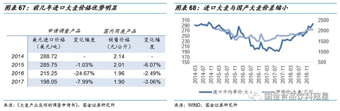 进口大麦与国产大麦价差缩小,价格上涨空间有限:进口大麦主要用于饲料和酿造,但饲料行业受猪瘟影响需求下降,并且进口大麦价格上涨后饲料企业成本端同样承压,部分企业选择玉米作为替代的饲料原料,总体来看饲料用进口大麦需求下降,使得酿造用进口大麦供给增加,供应商议价能力减弱。另一方面进口大麦经历了一年多的价格上涨,近期价格已处于近五年高位,与国产大麦的价差不断缩小,价格优势减弱。虽然国产啤麦仍处发展初期,但不排除会有啤酒企业因价格原因使用国产啤麦,这样也会对进口大麦形成一定的压力。结合供需和价格,我们认为进口大麦价格上涨空间有限,但具体仍需关注反倾销调查的结果。