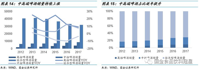 结构升级,中高端逐渐成主流:随着主流消费人群消费能力提升,不断注重产品品质和品牌,啤酒行业也迎来了消费升级。啤酒行业中经济型啤酒(5元以下)的销量自2013年起持续下降,占比也下降至71.2%。经济型啤酒的原有消费人群中越来越多的人开始追求品质,选择更优质的中档(5-10元)或高档(10元以上)啤酒。与此同时,高档啤酒近几年均维持超过10%的增长,中档啤酒消费量也在持续增加。整体来看,因为啤酒产品各档次价差较小,消费者多支付几块钱便可以消费更加优质的产品,消费升级阻力较小,未来预计中高端啤酒将逐渐成为啤酒行业的主流消费。