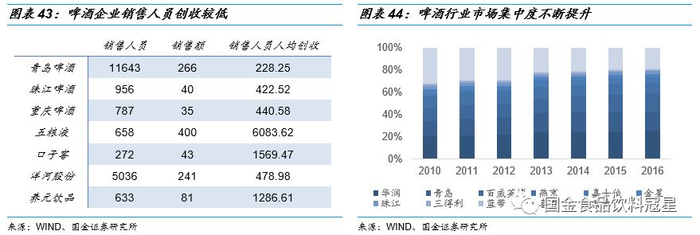 啤酒是深度分销份额最佳践行者,渠道壁垒深厚:在啤酒行业快速发展的十年中,各企业通过渠道竞争不断提升市占率,啤酒又属于单价低、消费频次高的产品,消费者粘性较弱,市场充分竞争。为了巩固市场,各企业采取深度分销的模式进行推广,厂商、销售人员、经销商和销售终端密切联系,公司销售人员直接管控终端,掌握终端销售情况。深度分销需要大量的人员支持,我们对比啤酒和其他直饮类企业销售人员人均创收发现,啤酒行业销售人员人均创收远低于其他行业。长时间的深度分销,也使得啤酒企业更了解其优势区域的消费者和竞争格局,形成极为深厚的渠道壁垒,新进入者短期内想形成一定的规模难度极大,渠道优势也成为啤酒企业的核心竞争优势。