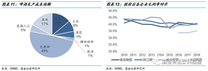 提价应对双重危机,效应明显:啤酒生产中包材和麦芽占比较高,其中包装物占比49%,麦芽占比14%。进口大麦自2017年底开始持续涨价,包材中箱纸板和玻璃2016年底开始涨价。为了应对原材料价格上涨的压力,并且行业内已近十年未出现规模性的涨价浪潮,17年底开始,各企业纷纷开启大规模提价。新一轮涨价不仅缓解了原材料价格上涨的压力,也使得各企业盈利能力和利润水平明显改善。