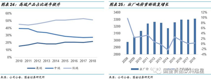 聚焦腰部以上产品,占据中高端市场领先地位:公司核心的青岛啤酒经典系列等产品在主流品牌中定位偏中高端,公司也是率先在啤酒行业中高端市场站稳脚跟的国产啤酒品牌。在14年开始行业规模下降的新阶段,公司也曾尝试通过提升低端产品占比,降低整体吨价的方式吸引消费者,收效甚微。公司逐渐意识到消费升级是未来发展的核心驱动力,消费者开始追求品质消费而非只关注价格,所以公司在产品投放上不断聚焦腰部以上的中高端产品,以青岛啤酒为主品牌,提高中高端产品销售量和品牌推广力度。公司高端产品占比也逐年提升,达到21.6%,出厂吨价也重新恢复增长,保持了中高端啤酒消费市场的领先地位。