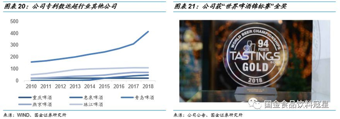 拥有全国唯一的国家级重点实验室,产品品质行业领先:公司在啤酒行业深耕多年,拥有啤酒行业唯一的国家重点实验室,拥有国内一流的研发平台,高水平的研发团队和领先的研究能力。截止2018年末公司拥有专利413项,远高于行业内其他公司,形成多项自主知识产权和核心技术。2018年青岛啤酒荣获“世界啤酒锦标赛”金奖、“欧洲啤酒之星”大奖,品质做到了全球领先并获认可。同时公司严控生产环节,创新食品安全管理,2018年公司凭借“双叠加三解码质量管理模式”获得第三届中国质量奖提名奖,这也是食品行业首次获得此项殊荣,公司质量管控能力受到专业认可。
