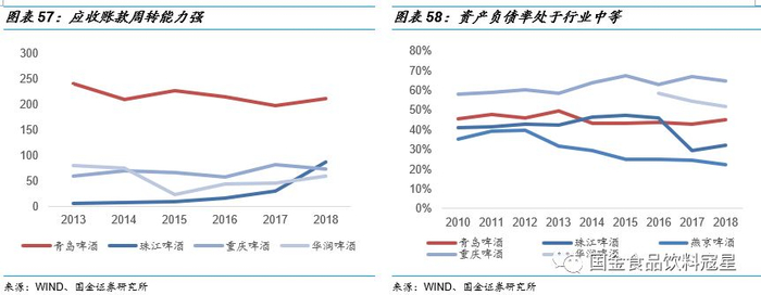 中高端领头羊,资产运营能力优异:青岛啤酒是国产啤酒中最早确立中高端产品形象的,铸就了以山东为核心的沿黄河优势销售区域。行业对比来看,青岛啤酒毛利率相对稳定,销售费用率处行业首位但持续改善,管理费用率长期处于行业低位,费用使用效率仍有提升空间。公司拥有较高的资产周转效率(营业周期仅57天)和极强的上下游议价能力(应收账款周转率211),负债中主要为经营负债,资产质量优质,资产管理能力优异。