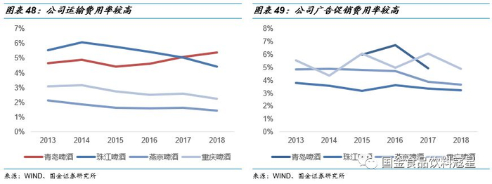 青岛啤酒销售费用投放处行业高位,费用投放效率有待提升:我们上文提到啤酒行业是深度分销的最佳践行者,对应的销售费用投放较高。销售费用投放既有支持地面空中投放的营销费用,又有支持营销人员的员工薪酬,又因为啤酒吨价较低,所以单位运输费用较高。同行业对比来看,青岛啤酒销售费用高于行业内其他上市公司,主要是公司每年广告促销费用超过10亿(18年会计调整至营收抵减),全国销售使得运输费用超过13亿,分别占据收入5%左右的比重,处于行业较高位置,整体来看公司全国化、深度分销和大面积的品牌推广使得销售费用投放较高。公司调整了市场助销费用口径后,销售费用与华润和珠啤等差距缩小,公司已经在战略规划中明确提出提升人员和费用投放效率,并且随着听装占比上升,销售区域的不断优化,公司各项销售费用的投放和使用将更趋合理和有效,整体销售费用率仍有下降空间。