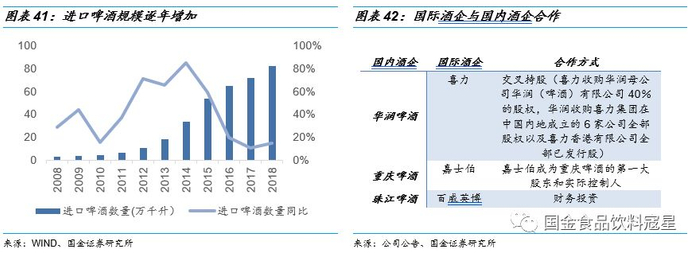 进口啤酒体量小+差异化定位,短期内对国产啤酒影响不大:以百威、喜力、科罗娜为代表的进口啤酒快速增长,近五年啤酒进口量年复合增速达到25%,进口量达到82.1万千升,进口啤酒受到消费者特别是年轻消费者的热捧。虽然进口啤酒快速增长,但相比于全世界产量第一的国产啤酒仍是少数,占比不足5%,整体体量较小,难以与国产啤酒形成规模上的抗衡。另一方面,进口啤酒销售渠道主要以夜场、KTV等高端消费为主,与国产啤酒餐饮即饮消费为主的渠道具有一定的差异性,所以我们认为短期内进口啤酒对国产啤酒的影响有限。但长期来看,随着国产啤酒高端化产品增多,必然要在高端渠道与进口啤酒正面竞争;并且百威、嘉士伯等国际知名啤酒企业也纷纷与国内厂商合作,合力拓展市场,知名酒企拥有多年的全球扩张经验,未来仍要看国产啤酒厂商能否凭借渠道优势和市场经验在与知名酒企竞争中占据上风。