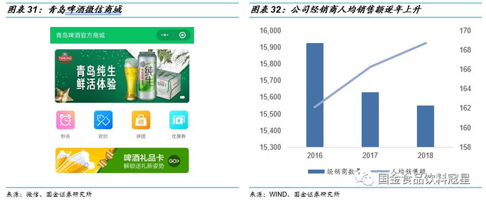 打造立体销售结构:公司不断完善经销商管理和维护体系,经销商数量达到15550个,重点培育战略经销商,提高经销商业务协同性,通过战略经销商提高对终端客户的掌控能力和区域市场分销能力,加快产品销售。公司也在积极通过互联网嫁接产品销售,并上线移动端“微信商城”、“青啤快购”等线上多入口销售渠道,打通“网络零售商+官方旗舰店+分销专营店+官方商城”的电商渠道体系。2018年与阿里巴巴零售通、京东商城、盒马鲜生等新零售平台合作,不断挖掘线上渠道机会,多触角满足互联网用户的消费需求。公司构建了“电商+门店+厂家直销”的立体销售平台,不断完善渠道结构。