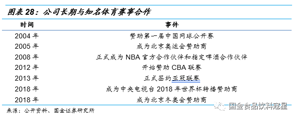 啤酒和体育天然契合,青啤深度贯彻体育营销:啤酒所具备的年轻、激情的属性与体育精神契合度高。观看体育比赛的人群和啤酒消费人群重合度高,2018年世界杯期间啤酒是大部分球迷助兴食品的首选,世界杯期间淘宝天猫销售啤酒超过3000万罐,比去年同期增长超过3倍,这也证明体育是最好的啤酒销售载体。青岛啤酒是较早发掘啤酒与体育关联度高的企业,自2004年赞助第一届中国网球公开赛开始与体育深度绑定,2005年成为北京奥运会赞助商,2008年成为NBA官方合作伙伴,2012年开始赞助CBA,2013年正式签约亚冠联赛,2018年成为世界杯转播赞助商,更是成为2022年北京冬奥会和冬残奥会官方赞助商,再度携手奥运。除大型赛事外,青岛啤酒更是山东省运会、世锦赛等比赛的赞助商,并通过啦啦队、足球宝贝选拔、借势组织策划体育互动活动等方式增加青岛啤酒曝光度,提升青岛啤酒品牌影响力。公司在体育营销方面深耕已久,经验丰富,并与各大体育赛事举办方,转播方保持良好关系,未来将继续通过体育营销提升品牌价值。
