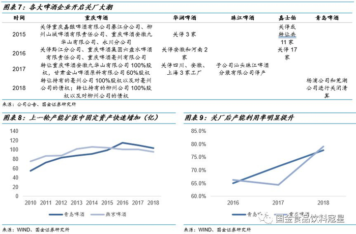 关厂清除落后亏损产能,提升产能利用率:在2013年之前十年的市场扩张过程中,各大啤酒企业纷纷通过并购和新建扩张产能,扩大产品覆盖范围。但快速扩张过程中过于追求产能和销售区域的增加,而未考虑到产能整合和市场接受度,使得产能利用率不足,部分产线持续亏损,拖累公司业绩。在啤酒行业总产能下降的背景下,各企业自2015年开始逐步关停亏损啤酒厂,减少成本消耗,提升产能利用率。
