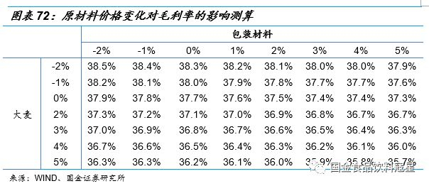 原材料价格波动对毛利率影响敏感性测算:公司原材料中包材(包括玻璃、易拉罐和纸箱)和大麦占原材料的比重超过60%,它们的价格波动对公司毛利率会产生直接的影响。我们以2018年公司毛利率为基准,测算两类核心原材料价格波动对公司毛利率的影响情况。结论是理想情况下若大麦和包装材料价格均下调2个百分点,则公司毛利率可增加至38.5%,提升0.8个百分点,悲观情况下若大麦和包装材料价格均同比上调5个百分点,毛利率会降至35.7%,下调2个百分点。我们预计近两年大麦价格上涨空间有限,包装材料已出现同比下滑趋势,所以原材料价格大幅提升的可能性不大,对毛利率的影响有限。并且我们的测算仅考虑了原材料价格对公司毛利率的影响而并未考虑结构升级等因素,所以公司整体毛利率大概率仍将继续提升。