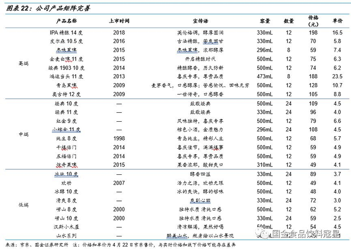 产品矩阵丰富:公司形成了较为完善的产品结构,高端有奥古特、鸿运当头、经典1903等系列,中端主要是青岛经典和纯生系列,低端以青岛冰爽、崂山和部分地方品牌为主,形成了完善的产品矩阵。公司的经典系列和纯生系列具有极高的品牌知名度和产品认知度,消费者认可度高。