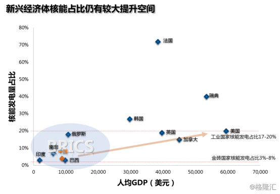 作为一种大基荷数、零排放、运行稳定、生产效率高的能源形式,核电在全球各主要经济体的发展过程中扮演着重要角色,各国核能发电的占比也与其经济发展水平呈正比关系。美国、加拿大、英国等发达国家的核电发电量占比达15%-20%,瑞典高达39%,法国甚至高达75%。以中国、俄罗斯、印度、巴西和南非为代表的新型经济体,人口众多、工业发展速度快、对新增电力需求旺盛,因此核电在新兴经济体中前景广阔,市场空间巨大。