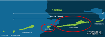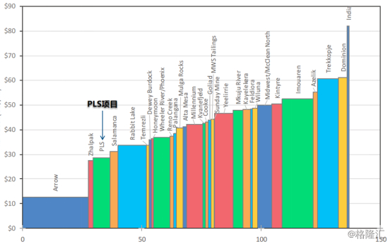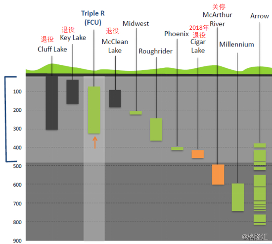 中广核矿业持有Fission Uranium,是其高品位及低产出成本的又一经典力作,Fission Uranium旗下的PLS项目主要矿体埋深仅100m -350m,是全球埋藏最浅的待开发高品位铀矿。PLS项目已探明的(下图红圈区域)矿产储量为36,533吨铀,控制级资源量为39,912吨铀,平均品位1.5%U,已识别矿化带达3.18km,具有较大的资源量增长潜力。由于PLS项目为可露天开采的浅藏铀矿,所以无论从矿山基建投入成本及开采成本来看均能达到很低的水平。根据UxC2018年报告,Fission Uranium旗下PLS项目的全成本位于全球同阶段可比铀矿山的1/4分位以下,成本优势明显。