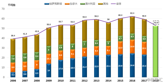 接下来我们来简单测算一下,由中国市场因素及其核电重启带来的铀矿长期增量需求会有多大的规模?截至2019年4月,中国在运核电机组达到45台,装机容量4298万千瓦,在建机组13台,装机容量1284万千瓦。我们沿用一座100万千瓦压水堆核电机组的首炉装料(可用三年)需要555吨天然铀,存量在运的每100万千瓦核电机组每年换料需要约185吨天然铀这些数据,假设这些在建机组会在三年后开始采购,则中国将拥有45台在运核电机组及总装机容量约为4298万千瓦,单每年的换料对天然铀的刚性需求约在7951吨,13台新增机组的首炉需求则约为7126吨,那么三年内中国确定性的对天然铀的需求将维持年均复合增长CAGR为23.77%的高速增长(占2018年全球长贸合约52,800吨的28.56%)。所以,中广核矿业近年来在全球范围对天然铀资源的频繁出手,其背后的意图是可以理解的,就是满足中国核电行业日益增长的需求,肩负起重要责任。