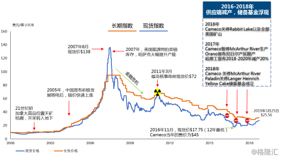 随着天然铀生产商主动减产及铀价复苏,为了规避铀价迅速攀升的风险,核电业主开始谋求签订长期采购合同,但正如前述,全球天然铀一次供应总量在2018年已经开始了下降趋势,过去十年全球铀矿山中高成本、低品位或效率低老矿陆续被关停,退出供给,此外长期的低迷价格也抑制了资本对新铀矿资源勘探和建设的投入,这些因素从根本上减少了未来全球天然铀的供给潜力。2017年至今,据我们观察发现,全球知名天然铀生产商和储备基金都在加大力度介入现货市场,呈明显的战略性囤积意图,可预期,当未来天然铀需求快速上升时,被人为减少的现货库存将势必造成铀价的向上剧烈波动。市场规模的稳定、需求的增加和热钱的涌入进一步加强了市场对铀价快速反弹的预期。