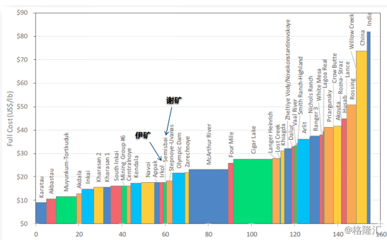Semizbay-U(谢米兹拜伊铀合伙企业)是由哈萨克斯坦国家原子能公司拥有51%股权,后者是世界上最大的铀生产商,占全球供应量的20%,Semizbay-U曾在2017年贡献了哈萨克斯坦国家原子能公司总产量的5%,Semizbay-U旗下主要的矿山分别为谢米兹拜伊铀矿和伊尔科利铀矿(以下分别简称“谢矿”和“伊矿”)。截至2018年12月31日,Semizbay-U旗下的谢矿和伊矿的铀储量分别为16,300吨和10,900吨,两矿所含铀的品位分别为0.042%及0.055%,远高于国际平均工业品位标准的0.03%品位认定,而最重要的是拥有两者的谢公司2018年运营成本仅为16.68美元每磅,这是中广核矿业得以成为在历史周期底部具备保持持续盈利能力的少数铀资源生产商的重要原因之一。与此同时,Semizbay-U旗下的谢矿和伊矿采用的是原位地浸(ISL)技术,无需岩石破碎,自动化程度高,对环境友好,安全高效,极大降低铀矿生产成本。