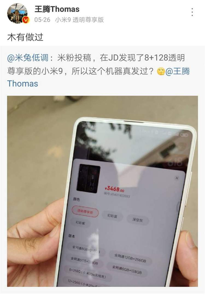 同一日,小米公司产品总监王腾回应称,小米公司并没有做过此版本的小米9手机。