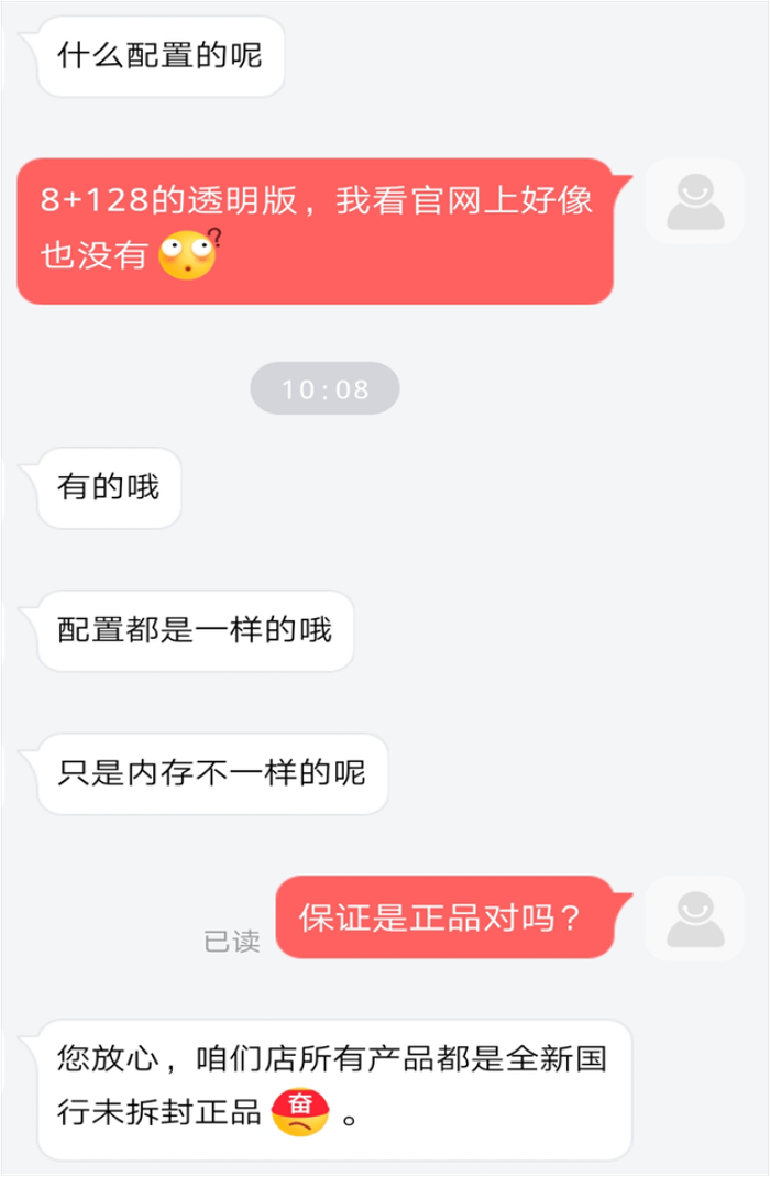 他还信誓旦旦的宣称,自己所卖的产品都是正品行货,包括8+128GB的透明尊享版。此手机还能全国联保,联保时间长达一年。
