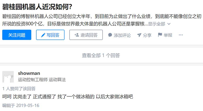 不过年初1月份,碧桂园副总裁张志远不再分管甘肃、兰碧、宁夏、青藏、新疆区域,改任博智林机器人公司执行总裁;碧桂园原副总裁朱剑敏兼任博智林机器人公司副总裁。据悉,这两位副总裁此前均从事地产业务。对此,知乎匿名用户表示,“空降领导,地产瞎指挥科研。”目前该回答已无法打开。