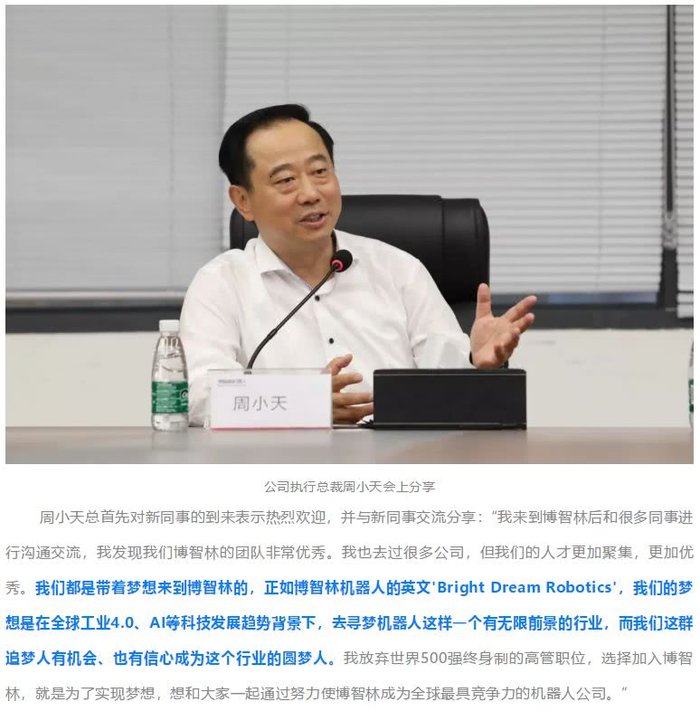 但是博智林官方公众号5月24日的文章表示,周小天首次以“公司执行总裁”的身份称,“我放弃世界500强终身制的高管职位,选择加入博智林,就是为了实现梦想,想和大家一起,通过努力,使得博智林成为全球最具竞争力的机器人公司。”