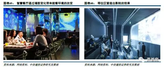 智慧餐厅通过360度全屋环绕式立体投影,呈现梵高星空、桃园仙境等6大主题场景,带来身临其境的沉浸式体验。同时在等位时,相比于原先传统海底捞餐厅提供零食、美甲、飞行棋等服务,智慧餐厅的等位区开始营造影院式氛围,并且消费者可以借助大屏参与互动游戏,互动感大幅提升,带来等位时更好的体验。且在内部点餐的pad、餐桌等设施上,也大幅添加互动体验感,实现各环节的互动。