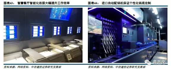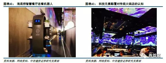 国内火锅第一巨头海底捞的智慧餐厅于去年开业,成为具有引领和颠覆效应的新式火锅店。海底捞智慧餐厅不仅从外观和风格上充满了科技感和现代感,包括在幕墙、餐桌等领域增加可互动元素,提升顾客就餐体验。同时也利用高科技大幅提升了配餐和送餐等的效率,所有菜品实现智能仓储、自动跟踪管理、自动配餐及结合送餐机器人的快速送餐,大幅提升效率。另外,科技元素也实现了更多的个性化因素,比如自动配锅机,消费者可通过电脑终端实现对配料和锅底等的精确配比,充分实现了个性化。对于以服务品质闻名业内的海底捞餐厅,科技元素不仅没有缩减热情服务所带来的口碑,反而成为进一步提升服务品质的重要辅助,对于海底捞等通过管理模式形成内部服务差异化竞争的企业来说,科技的优势能更好的加强固有竞争壁垒的坚固。