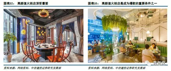 而近五年以进驻大型商业中心的中高端火锅店为代表,大量火锅店在固有的传统火锅店装修风格上进行大幅度改造,形成了很多差异化强,且“颜值”非常高的火锅店,这也与中高端火锅开始崛起、火锅消费客单价不断提升、客群逐渐向高端转移有一定的联系,高消费档次人群对于就餐环境的优雅和舒适要求较高。作为与传统大众火锅产品形成差异化的重要手段,高档次和高颜值的火锅店开始出现在租金较高的高档商业区、商务场所,并借由优质的环境和对火锅品质的持续追求,大幅提升了客单价水平,与大众火锅形成明显差距。