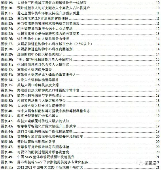火锅企业IP塑造和品牌文化培育带来火锅品牌价值提升,带动周边产品和服务的延伸,品牌价值高带来高附加值;火锅的社交属性较强,借助此打造社交性平台和会员平台,提升服务体验;渠道下沉趋势为大势所趋,未来三线及以下城市消费空间巨大;火锅行业出现新式和传统火锅文化碰撞,传统火锅在核心元素上仍具有较强顾客粘性,新式火锅文化仍需坚持和发扬传统火锅社交属性强、底料和调料丰富、菜品新鲜多元等核心元素,同时火锅文化也朝着多元化方向发展,高颜值火锅、特色食材火锅发展空间广阔;标准化食品成为火锅及餐饮行业寻求扩张的必由之路,火锅具备易标准化优势,底料、调味料及自热火锅等标准化趋势崛起,市场潜在空间大;科技元素大量融入,大幅提升了火锅餐厅运营效率,也进一步提升了服务水平,SaaS平台等科技提升渗透火锅整条产业链管控,科技应用场景将更加丰富;线上参与度越来越高,大幅延展了消费场景和消费时间;火锅巨头开始进军其他餐饮品类,提升受众宽度及综合竞争力,加强品牌价值;