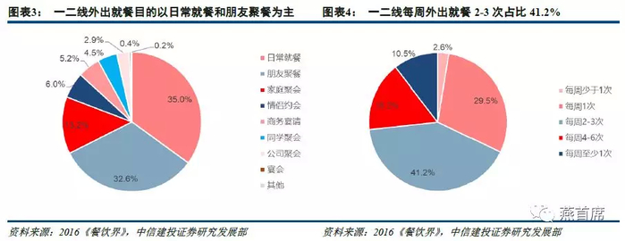 从就餐目的看,目前一二线仍以朋友聚餐和日常就餐为主,一二线城市每周外出及聚餐2次及以上的人群占比约60%,占比较高,从外出就餐频次上保证了一二线城市较大的餐饮需求,考虑到一二线城市在工作时间和强度上的压力以及外卖餐饮的崛起,外出就餐的需求提升空间预计不大。