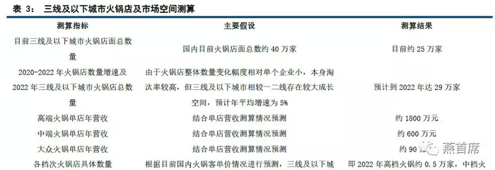 考虑三四线城市人均客单价略低,翻台率可能略低,预计2022年其高端火锅、中端火锅和大众火锅的单店销售额为1800万元、600万元、90万元,对应2022年三线及以下城市各档次火锅店家数为0.5万家,3万家,25.5万家,对应的三线及以下城市火锅餐厅市场空间约4995亿元。