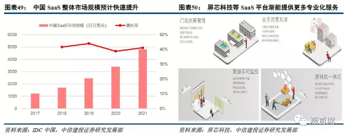 因目前的SaaS主要功能仍较多集中在收银结账、数据处理等环节,对于餐饮企业和火锅企业的经营效率提升不明显,但目前越来越多的餐饮SaaS平台开始提供从上游至下游的餐饮产业链一体化服务,为餐饮企业的上游供应链管控,中游生产、运输及数据处理,下游门店运营、人员管理等环节提供全面和深入的服务,通过大数据处理和智能化决策,帮助餐饮及火锅企业节省大量成本,在组织战略决策上做出更优的选择。