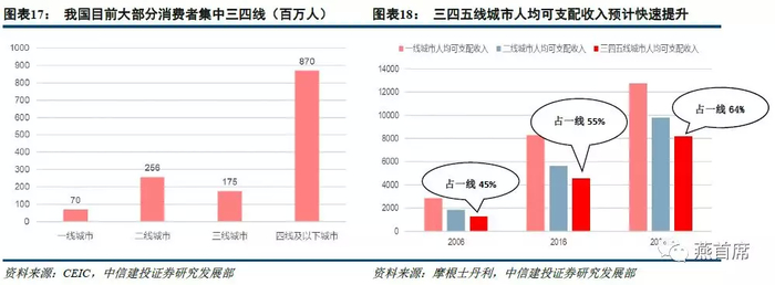 根据《第一财经周刊》数据,目前我国三线城市约70个,单个城市人口约200万以上。目前考虑到供应链、基础设施等问题,中高端火锅在四五线城市的布局相对较少,渠道下沉主要以三线城市为主,三线城市总人口据统计约3亿,潜在消费者市场较大。根据《第一财经周刊》,2017年新开大型购物中心中,三线及以下城市占比超30%,三线及以下城市的消费潜力逐渐显现,成为未来布局的重要战场。