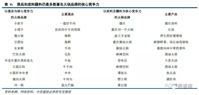 “火锅必点”食材如毛肚、羊肉、牛肉、丸子、海鲜等,是吸引消费者的重要因素,这些食材往往成为一个火锅店的核心竞争力和主打产品,比如川渝地区较多以新鲜毛肚为特色的火锅,东来顺的羊肉、潮汕火锅的牛肉丸,以及一些主打海鲜、斑鱼类的火锅等。有受欢迎度较高的菜品并且种类丰富是吸引火锅消费者的重要因素之一,消费者对于这些菜品的新鲜度、品质以及口感等往往有较高的要求,如若该类特色菜品的品质较高,对于消费者的粘性和吸引力将大幅提升。