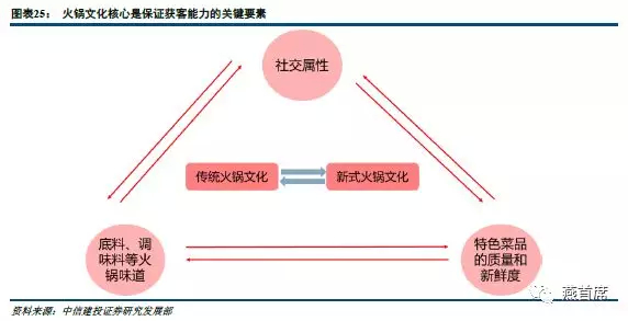 相对于传统火锅就餐氛围热烈,并在朋友聚餐和家庭聚会时突出团圆火热的气氛,目前的休闲餐饮更注重相对于工作和家庭的“第三空间”的概念,突出“第三空间”概念和延长消费时间的就餐形式也成为快速崛起的一种需求,且将作为与传统火锅不同的另一条细分赛道。火锅本身的风味和特色仍然是不同餐厅文化的核心连接点。在延续传统火锅精髓的基础上,在整体就餐环境的变化上,可以针对不同地区的不同需求客群进行调整,休闲需求作为迅速崛起的需求形式,未来如海底捞、呷哺呷哺等龙头火锅企业,也有望延伸自身的服务链条和内容,在餐厅内提供更多休闲设施和差异化休闲服务,以期产生更多元化的火锅文化。