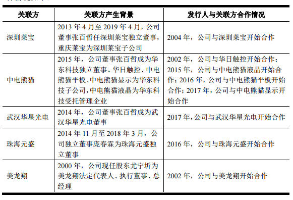 清溢光电科创板IPO招股书显示,深圳市华星光电技术有限公司是清溢光电2018年的第四大客户,公司向深圳华星光电技术销售了3106万元产品,这里面包括了对深圳市华星光电技术及其子公司武汉华星光电半导体显示技术有限公司、深圳市华星光电半导体显示技术有限公司、武汉华星光电技术的有限公司的销售收入。而张百哲在武汉华星光电技术有限公司担任董事一职;此外,南京华东电子及其3家子公司和1家参股公司也均为清溢光电的客户,仅2018年,清溢光电向华东科技子公司中电熊猫销售531.87万元产品,而张百哲在南京华东电子及其子公司担任独立董事。