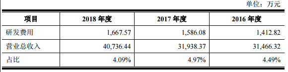 作为一家科创板拟上市企业,清溢光电在研发方面的投入并不高。2016-2018年,清溢光电的研发投入金额分别为1412.82万元、1586.08万元和1667.57万元,占当期营业收入的比例分别为4.49%、4.97%和4.09%。