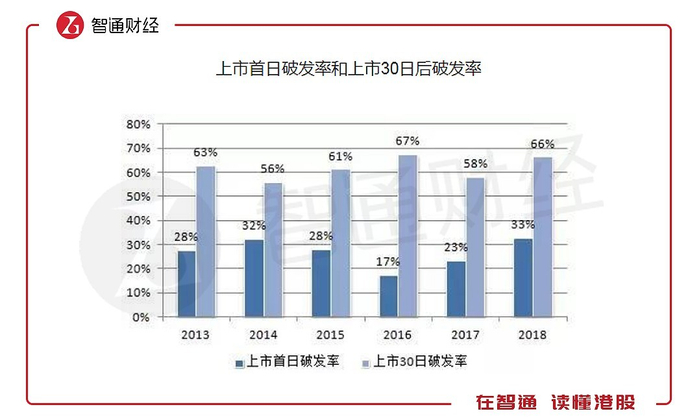 智通财经APP此前统计,2018年新股首日破发率为33%,上市30日后破发率为66%;截至2018年12月27日,共有154只股跌穿发行价,破发率已经提高至73.33%,基本上每4只新股就有3只破发。且截至去年底跌幅超过20%的新股的占比高达50%。