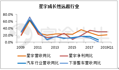 并且和整个行业、下游整车比较,星宇一直保持很好的成长性,尤其是2017年汽车销量进入低增长后,公司丝毫未受影响,发展独树一帜。从2011年起,星宇业绩增速常年维持在25%上下,汽车行业则在18年停滞。