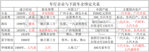 汽车零部件和车企是业务绑定的关系,车灯也不例外。如华域视觉是上汽系,客户集中在上汽大众、上汽通用;广州斯坦雷由广汽和斯坦雷合资,本田是斯坦雷股东,所以客户集中在广本、东本;海拉为大众配套车灯,所以长春海拉客户主要是一汽大众。
