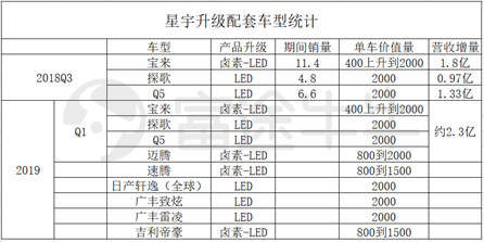 分析星宇2018年、19Q1业绩超预期原因,LED化是主要动力。2018年公司营收50.7亿,同比+19%,19Q1营收14.2亿,同比+21%。18Q3公司开始向一汽大众旗下宝来、探歌、Q5配套LED前照灯,按升级LED灯后销量11.4/4.8/6.6万台计算,「价升」带动营收增加4.1亿,贡献营收8%的增长。类似的,19Q1四款LED车型单车价值量提升带来2.3亿营收增量,贡献营收19%的增长。