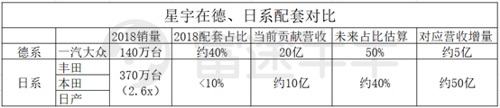 从销售体量看,配套日系将支撑公司中期成长。2018年,一汽大众销量140万台,星宇配套占比约40%,对应营收20亿左右,而日系销量丰田+本田+日产合计约370万台,是一汽大众2.6倍,目前配套占比10%,如果未来渗透率能到40%,意味着营收翻倍。2019下半年星宇开始配套广丰雷凌、广丰致炫、日产全球轩逸(月销5-6万辆)。