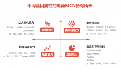 张宇彤介绍,不同基因属性的电商网红机构各有所长,红人孵化能力、柔性供应链、运营能力、选品和导购能力是网红机构们具备的四大核心能力。只要在其中一个领域有超强能力,就可能脱颖而出。