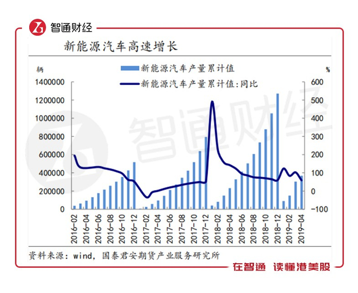 智通财经APP注意到,尽管今年以来汽车产销总体下滑,但新能源车高速增长或持续,如1-5月,新能源汽车产销分别完成48万辆、46.4万辆,分别同比增长46%、41.5%。而与2017年同期相比,今年前5月的累计销量大涨271%。