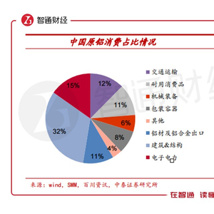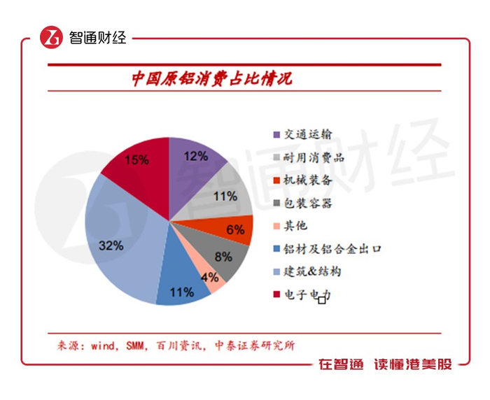 从消费端来看,中国原铝的消费占比中房屋建筑等方面占比为32%,此外电子电力、交通运输方面占比分别为15%、12%。
