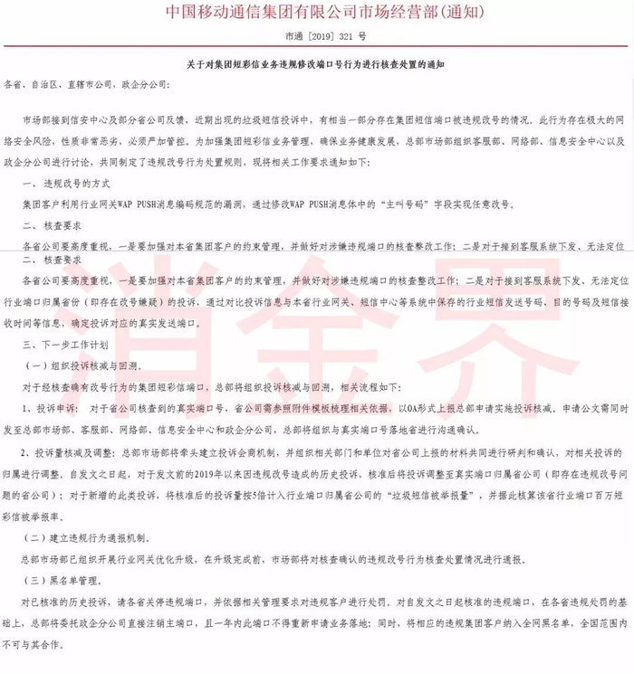 文件中指出,“中国移动市场部接到信安中心及部分省公司反馈,近期出现的垃圾短信投诉中,有相当一部分存在集团短信端口被违规改号的情况,此行为存在极大的网络安全风险,性质非常恶劣,必须严加管控。”