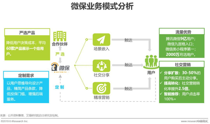 微保是腾讯控股旗下的保险平台,2017年10月微保取得保监会批复的经营保险代理业务许可证,正式入局互联网保险行业从事保险经纪代理业务。微保坐拥微信的庞大用户客群,在获客上具有得天独厚的优势,依托腾讯社交,互联网保险产品可以通过用户朋友圈的推荐广泛传播。在产品端,微保围绕用户需求精选产品,并在产品设计上精细打磨,解决条例复杂、保费过高、理赔难等传统行业痛点。
